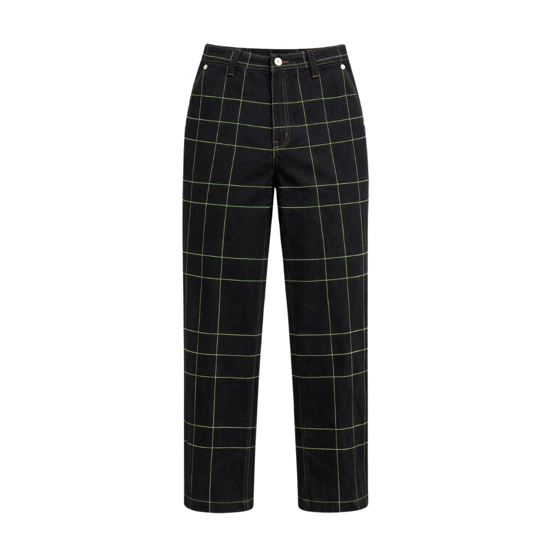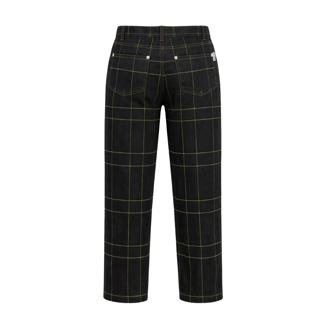 Black relaxed-fit denim trousers featuring bold contrast topstitching in a grid pattern. Designed with classic front and back pockets, and finished with a zip-fly and button closure for everyday ease.