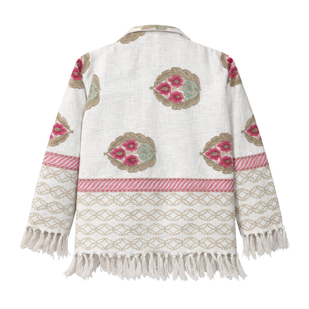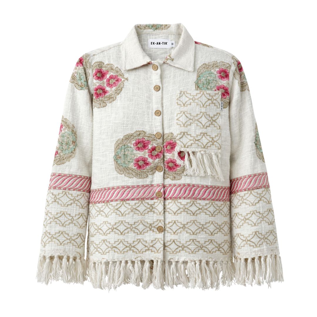 Crafted from 100% handspun fabric, the Mkindu Jacket 2.0 features unique variations in thread size, giving it an authentic, luxurious feel. Hand block printed by local artisans, each jacket is one-of-a-kind. It is finished with tassels along the hem, a front chest pocket, and button fastening.