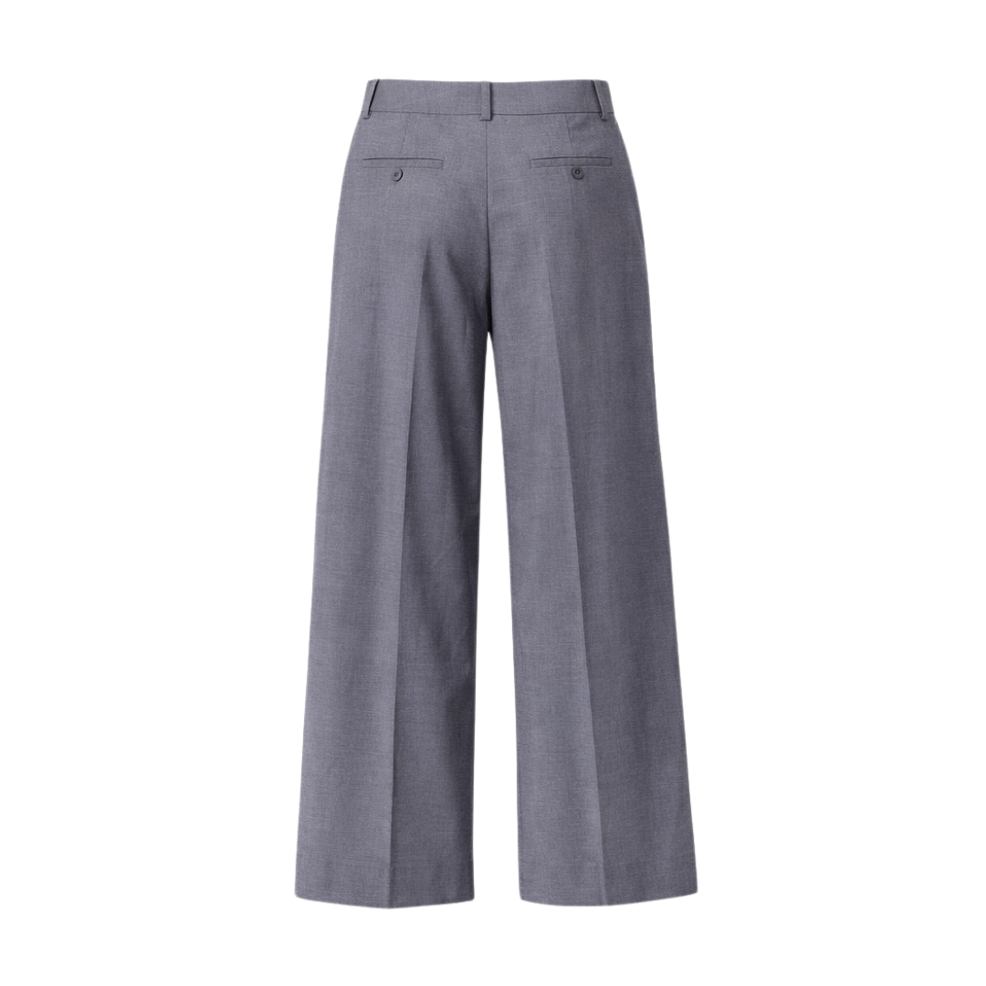 Grey wide-leg pants designed with a clean pleated front and subtle front slit detail. Features two side slit pockets and two back welt pockets, finished with a button and zip fastening for a tailored look.