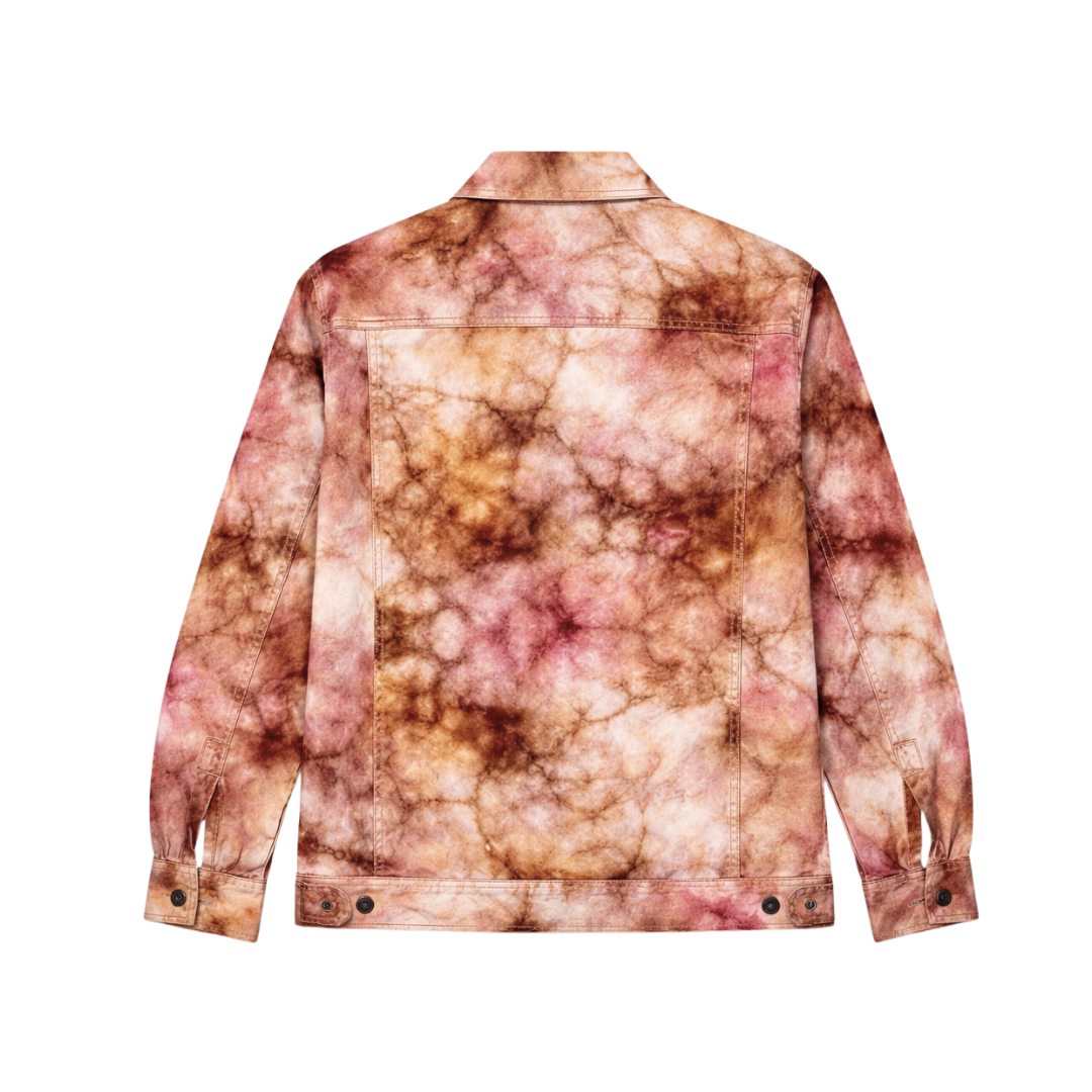 Crafted from durable canvas and hand tie-dyed, this jacket carries rich, earthy tones, making every piece truly one of a kind. Designed in a boxy fit (Chest: 48”, Length: 29”), it features a structured silhouette with functional utility pockets.